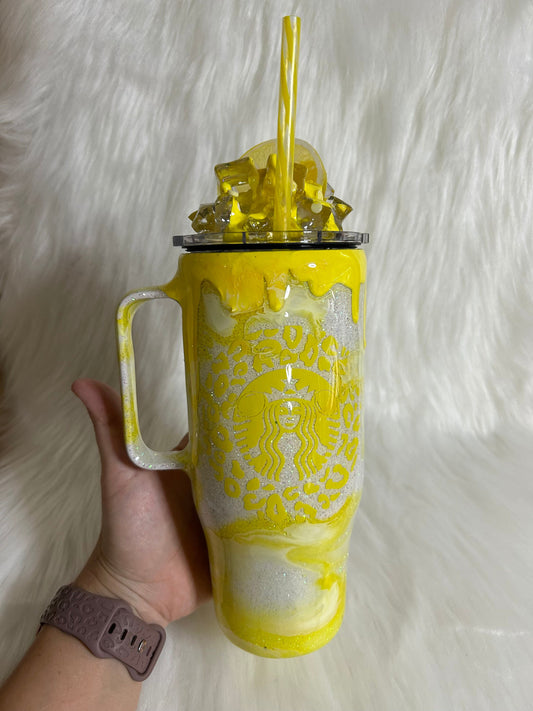Lemonade “Mocha” custom tumbler, 3D lemon and ice topper, leopard print and lemons logo, 3D yellow dripping, crushed ice and ice cubes