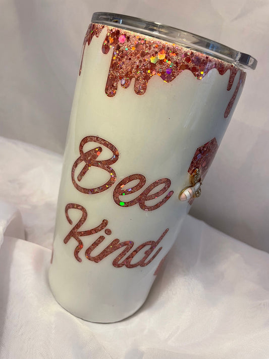 Honey bee tumbler, Bee Kind Peekaboo tumbler with embellishment (choose your cup style and size), pink glitter background and 3d pink bees