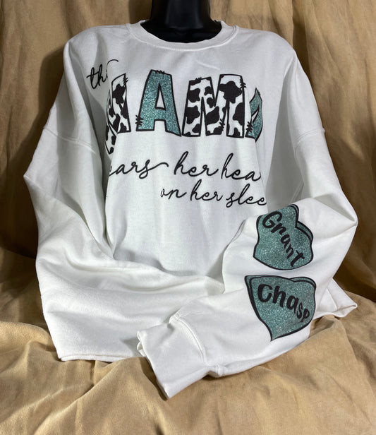 This MAMA wears her heart on her sleeve customizable/personalizeable Sweater sweatshirt tee in white or grey cow print.