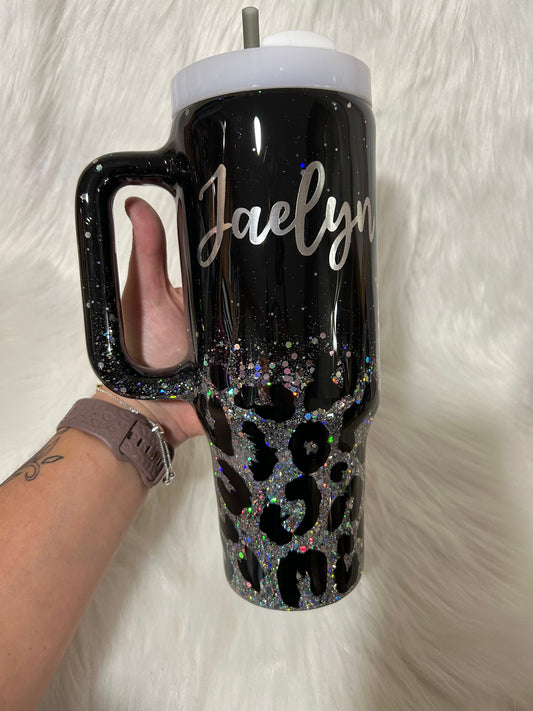 Leopard Print Tumbler: Black & Silver Glitter, Personalized Cup