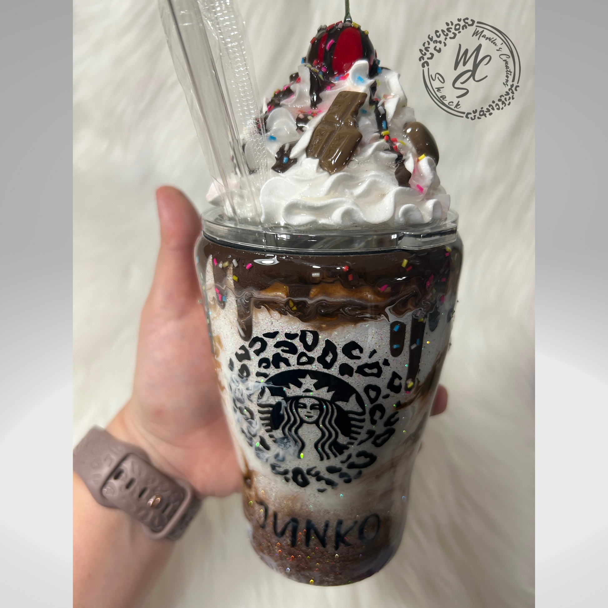 Chocolate Mocha tumbler, custom 3d tumbler with realistic whipped cream removable topper for easy cleaning and chocolate drizzle 3d dripping glitter cup.